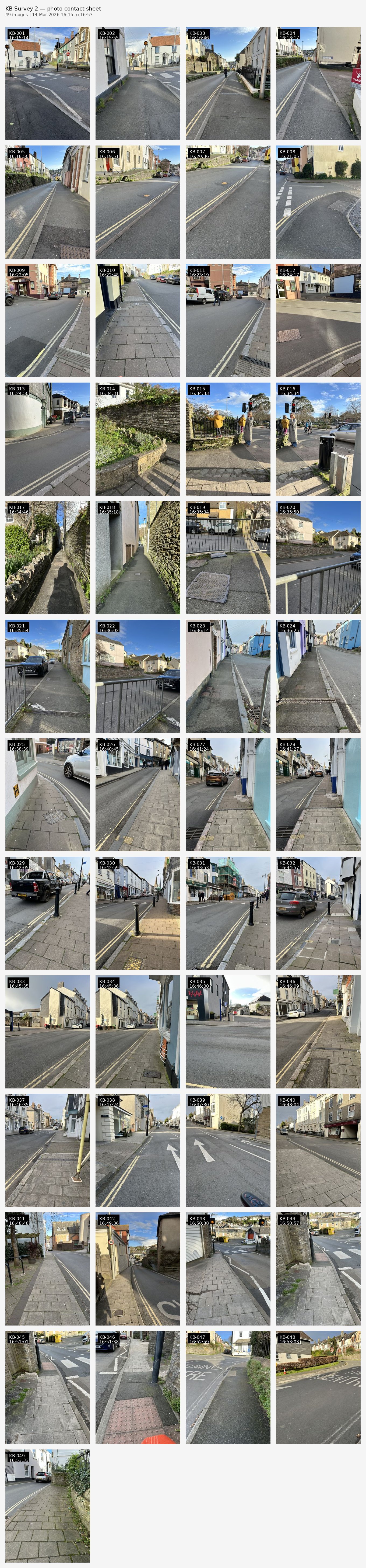 The first survey on this site documents wheelchair access problems in Kingsbridge town centre. The key finding is simple: there is visible accessibility work in part of the centre, but not a continuous accessible route to major everyday destinations such as Tesco and the Duncombe Street side of town.